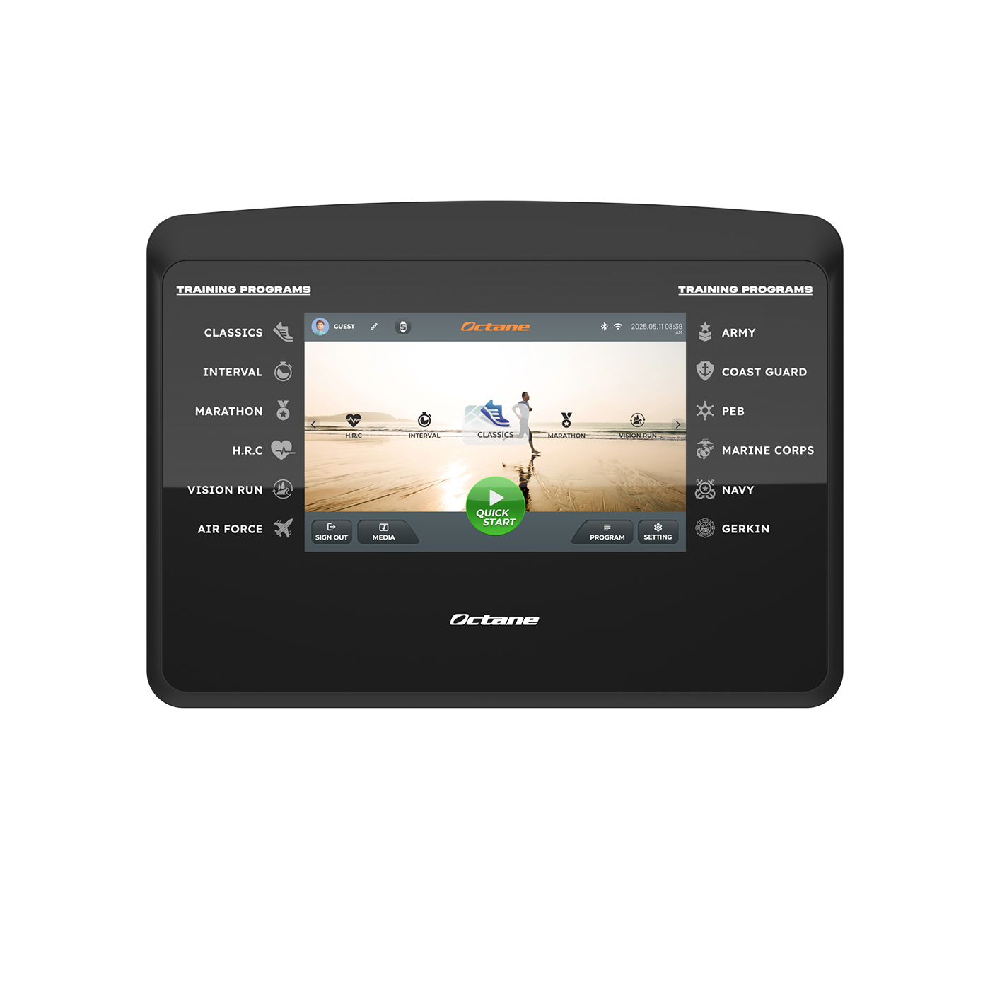 Built for reliable performance, the Octane Treadmill with its 10” touchscreen console keeps your workouts simple, focused, and effective. Designed for ease of use, it delivers all the essential features you need—along with just the right amount of entertainment to keep you motivated every step of the way.